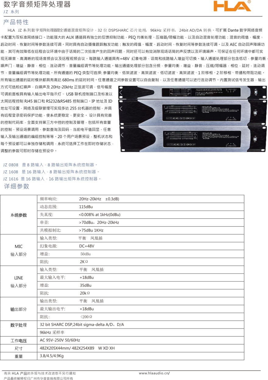 HLA JZ 系列数字矩阵处理器是全通道混音矩阵设计,32位DSPSHARC芯片处理,96kHz采样率,24bitAD DA转换。